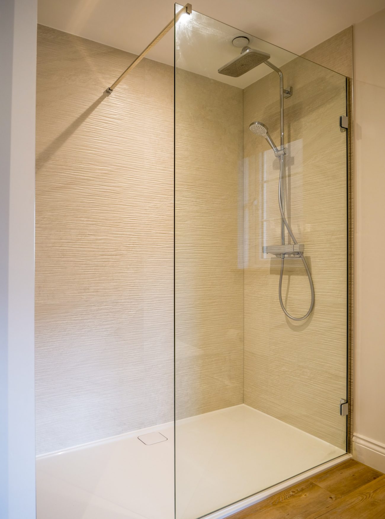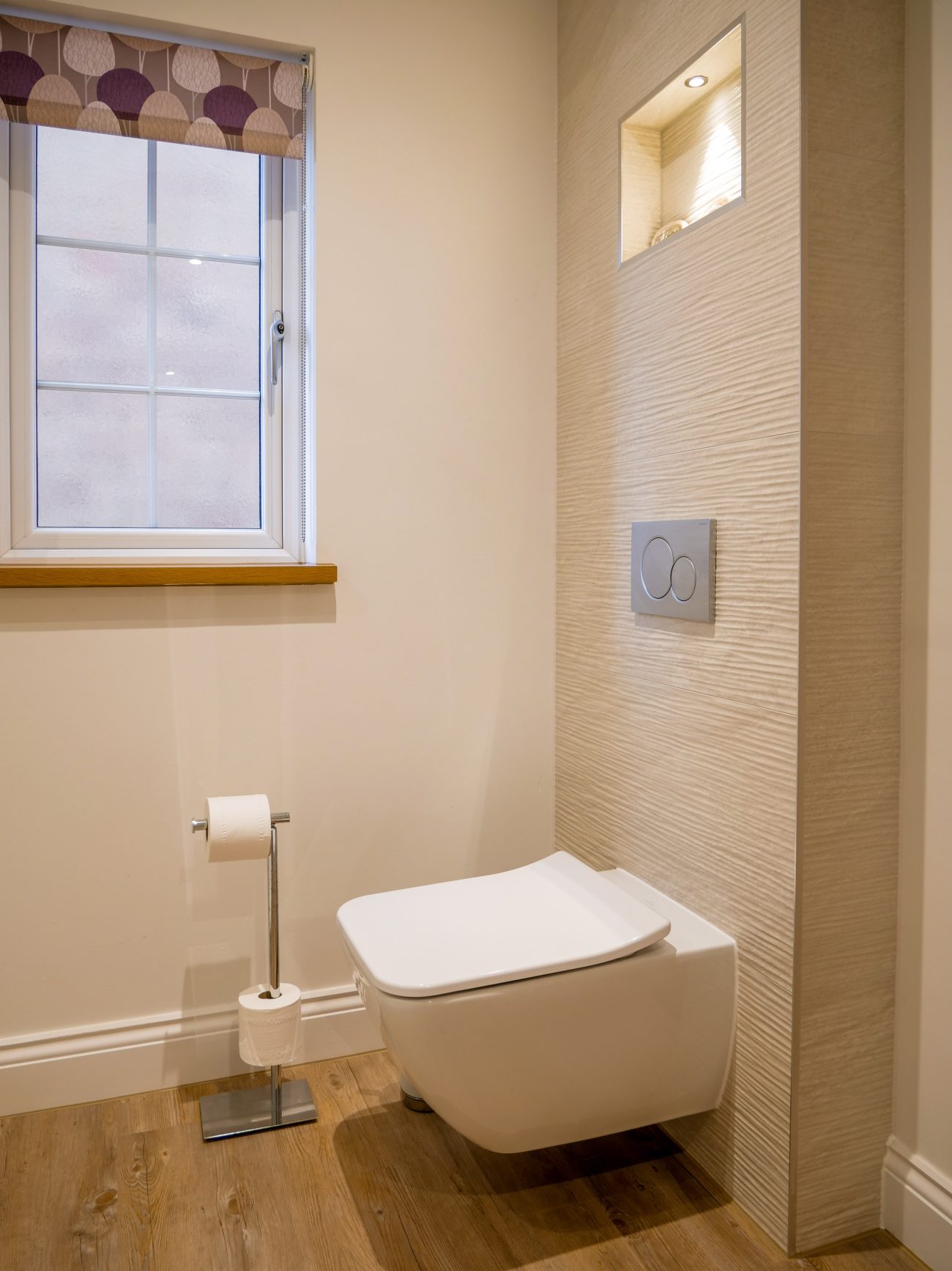 High end sanitary ware and a custom sink unit creates a unique bathroom. The sink unit features a false drawer fronted door to accommodate for the towel rail.